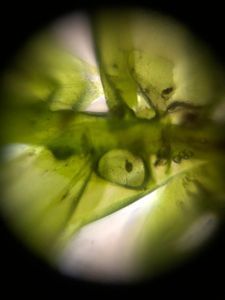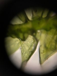 Thanks to the winter rains the past few days/a few weeks ago, we’re finally getting lush greenery around campus. So I decided to collect some moss growing near Lake Lag to examine with my foldscope. The moss didn’t require too much preparation, since it is pretty thin/translucent even when intact. I took a small bit (one stem, basically) of the moss and placed it on the slide, and added a drop of water before placing the cover slide on top.