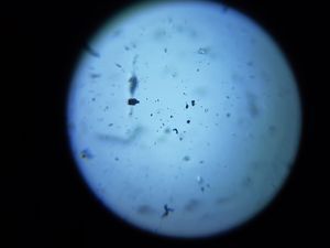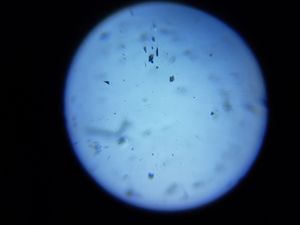 crystal shaped and numerous black dots are seen using foldscope from drinking water. sample 26