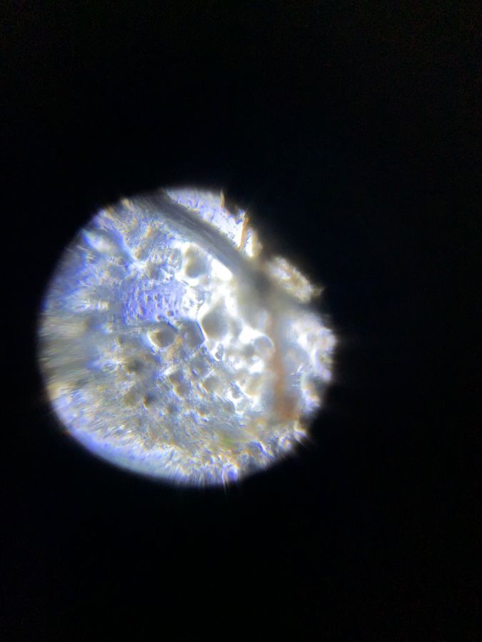 This picture was taken through a foldscope. The picture shows more swamp water which was acquired from around the Bay Area near Stanford University. In this sample, many plant microbes were visualized. The sample in the picture was prepared by using a normal glass slide with a cover slip. In order to prevent the sample from being destroyed tape was used in order to create a chamber. The light source illuminating the sample originated from the light which came from the foldscope kit. The picture itself was taken by placing an iPhone XS camera against the lens. When taking the picture, the magnets would interfere with the mechanisms in the camera. This would attribute to some of the blurriness seen in the photo. In the sample, many plantlike microbes are seen. They look very similar to spores There were many of them dispersed throughout the sample. It is hard to tell for sure what the identity of these microbes are, however, it is suspected that they could be some sort of fungus or fern.