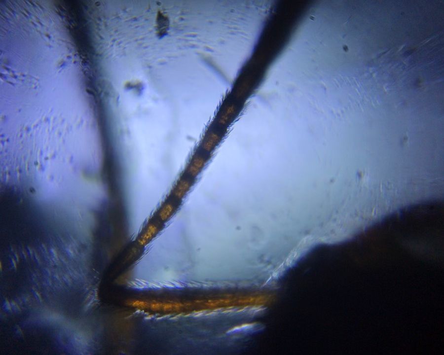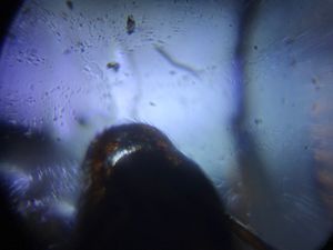 I have been wanting to look at an insect under my Foldscope for a while now, and I was finally able to today from a very small ant brought in off of some flowering plants. I wanted to keep the ant alive, particularly so that I would be able to investigate its movement patterns. It was very difficult to do, but I managed to contain the ant in a closed sample tube while preparing a slide with tape to make a well of sorts with which I could cage the ant. I then guided the ant into the tape cage and trapped it with the cover glass. It ended up being enough room so that the ant was still alive and could waggle around but not move freely, which was perfect. There were moments when the ant was completely still, but for the most part it moved around. Although this made it hard to capture a clear image, it was worth it for the behavior patterns I could observe.
