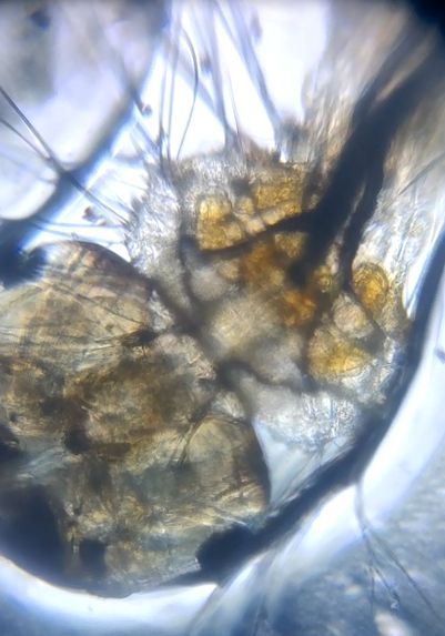 Mosquito larvae also known as “wrigglers” are aquatic organisms. Under foldscope a large head along with a functional circulatory system can be observed.