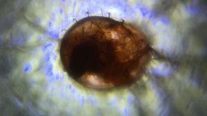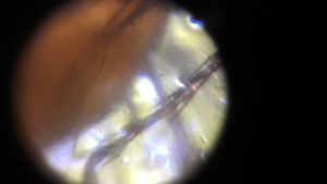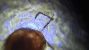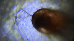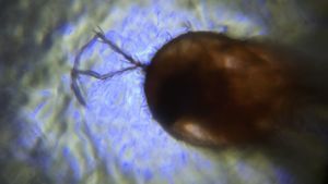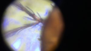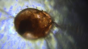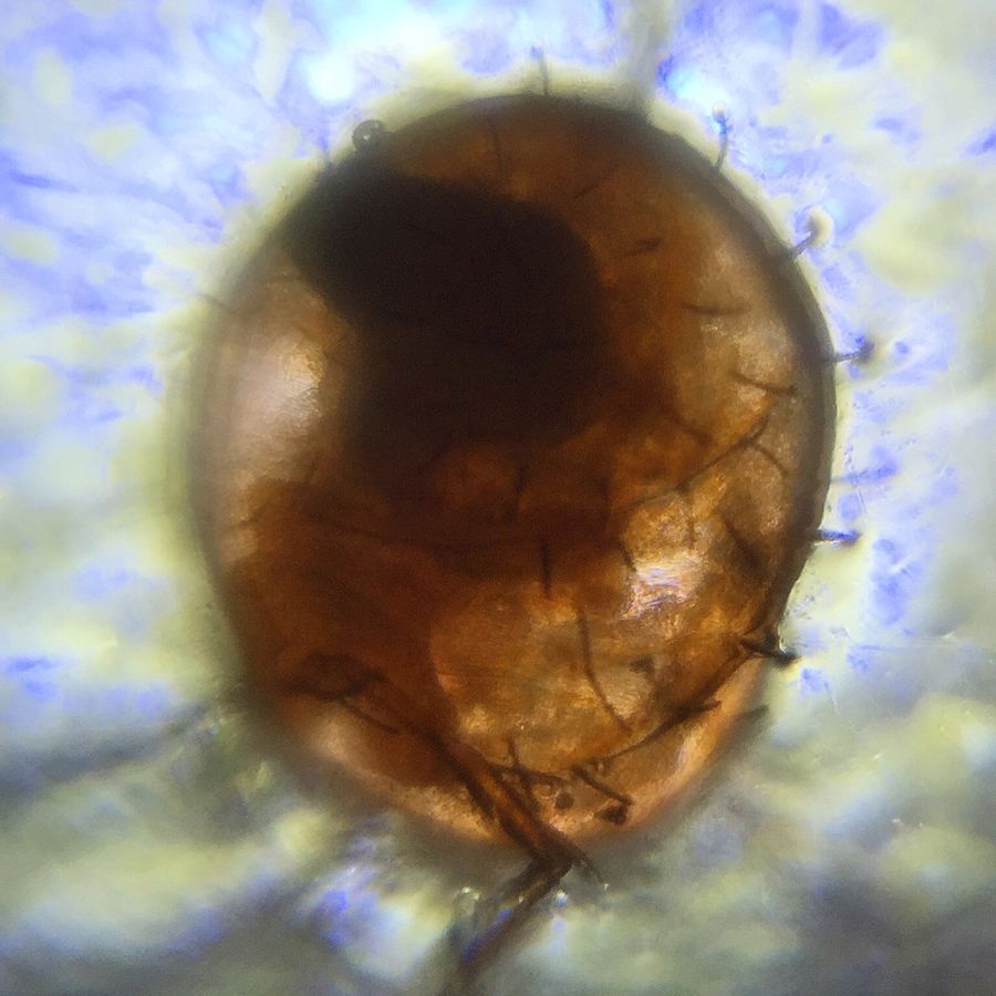 This is a mite – probably a larva belonging to the Erythraeidae family. I picked it up from a harvestman (Acanthopachylus aculeatus, image here ) the mite was parasitizing. I’d rather have used glass slides and coverslips but couldn’t find any here in Uruguay where I am right now.