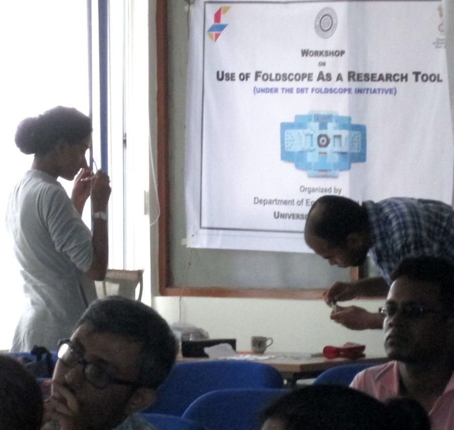 Demonstrating the use of foldscope The workshop started with a brief speech of Dr. Punarbasu Chaudhuri introducing Foldscope and how this paper microscope can be utilised in schools for quality monitoring of Water sample. After this, Foldscope team members of University of Calcutta demonstrated how to use Foldscope and making projection with Foldscope.