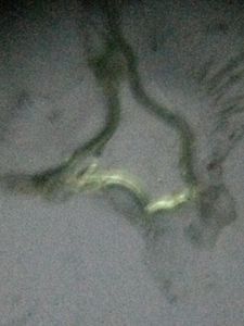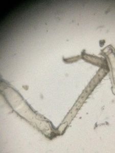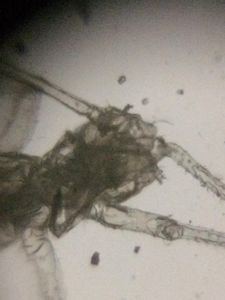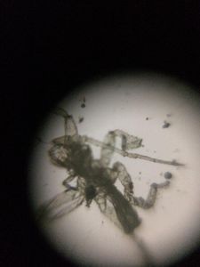With our foldscopes ready, we fixed samples and observed some nymphs and their moulted casts. The casts showed some blue coloured luminescence under normal light at the fringe and on observing under polarized film it appeared green.