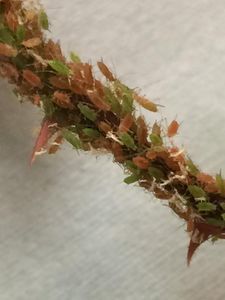 Red and green coloured aphids were noticed on Rose plant. Close observation showed white flies and sticky exudation on the leaves. I had read in my biology class as insects moult they shed their casts and their whitish cast skins may be mistaken for whiteflies.