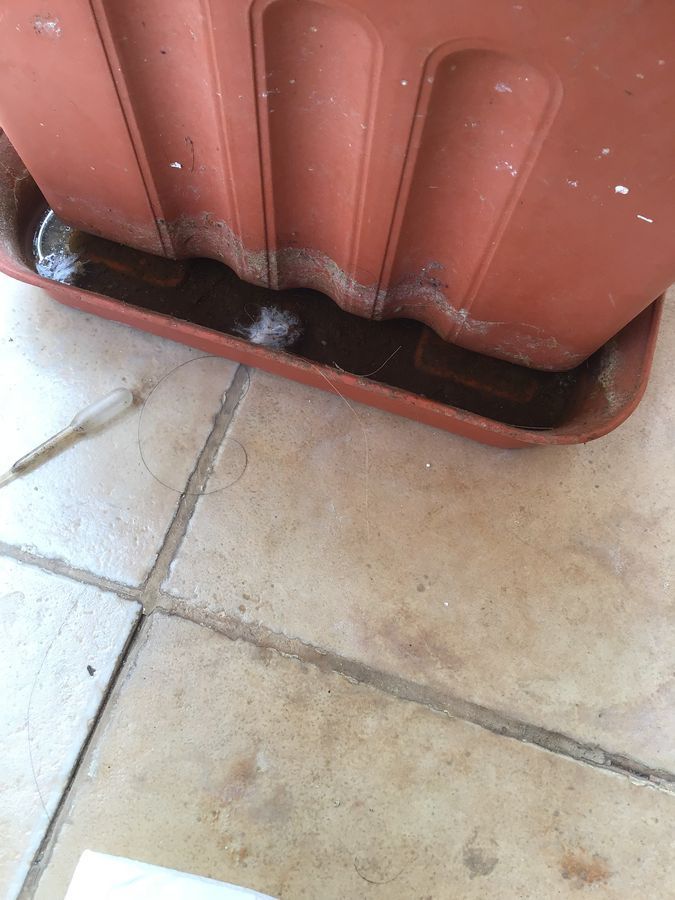 White patches on the collected excess water from the pot The cottony white patches turned out to be some fungi thriving on the stagnant water. I also observed a single filament from that cottony patch, which was a fungal mycelium.