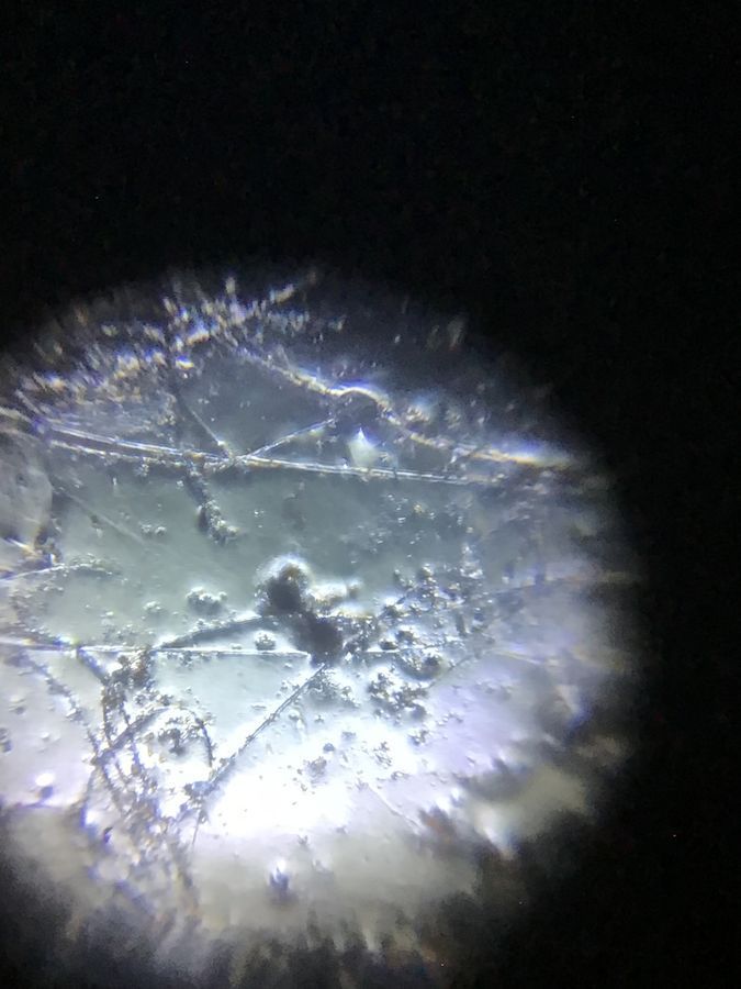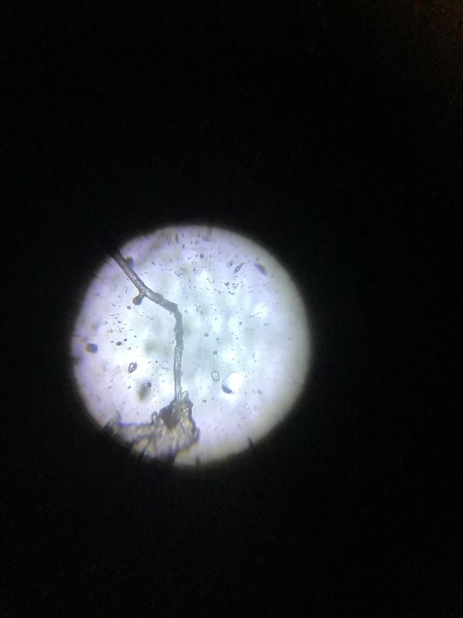 White cottony patch magnified under Foldscope, showing a network of fungal mycelium