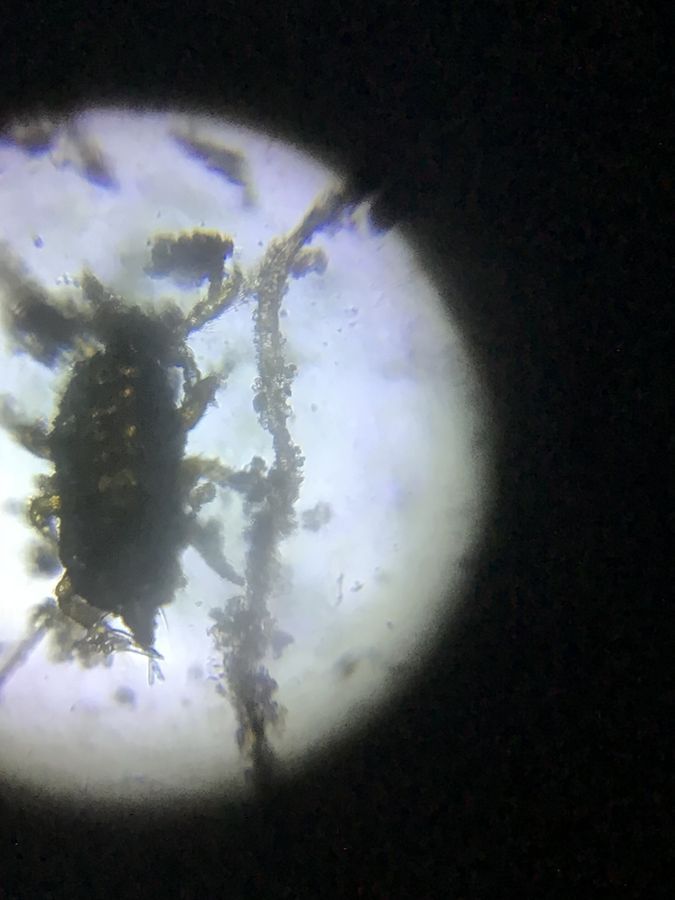 Dividing or conjugating Euplotes in the water drop? The water drop contained particles of mud spilled out from the potted plant. In the midst of the mud was an eight legged bug. It must be a type of arachnid. But what is it?