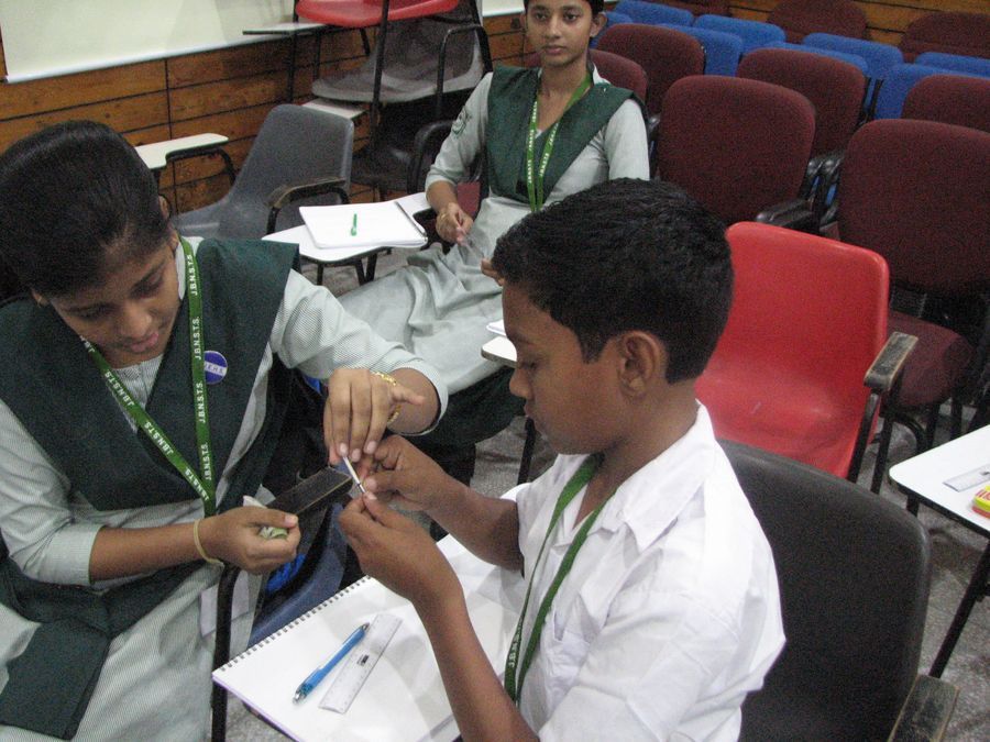 Participants spinning a single hair strand to measure the width of single hair strand Measurement of single hair strand using foldscope- In this session, Stage Micrometer was introduced to the participants and by calibrating stage micrometre with a ruler scale (centimetre scale) we determined the width of a single strand of hair. It was also done at various portion of hair to get the range of the width of human hair.