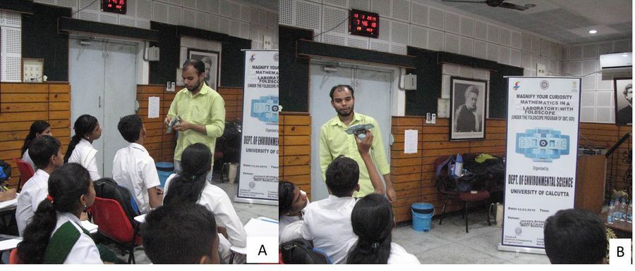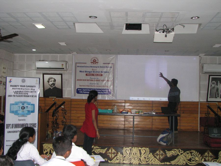 A workshop named “Magnify Your Curiosity-Mathematics in a Laboratory with Foldscope” was organized by Department of Environmental Science, University of Calcutta on the evening of 12 th March 2019 at Jagadis Bose National Science Talent Search, Kolkata, West Bengal, India, in collaboration with Howrah Vigyan Chetna Samannaya.