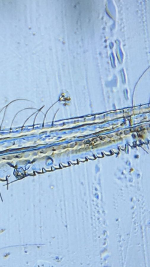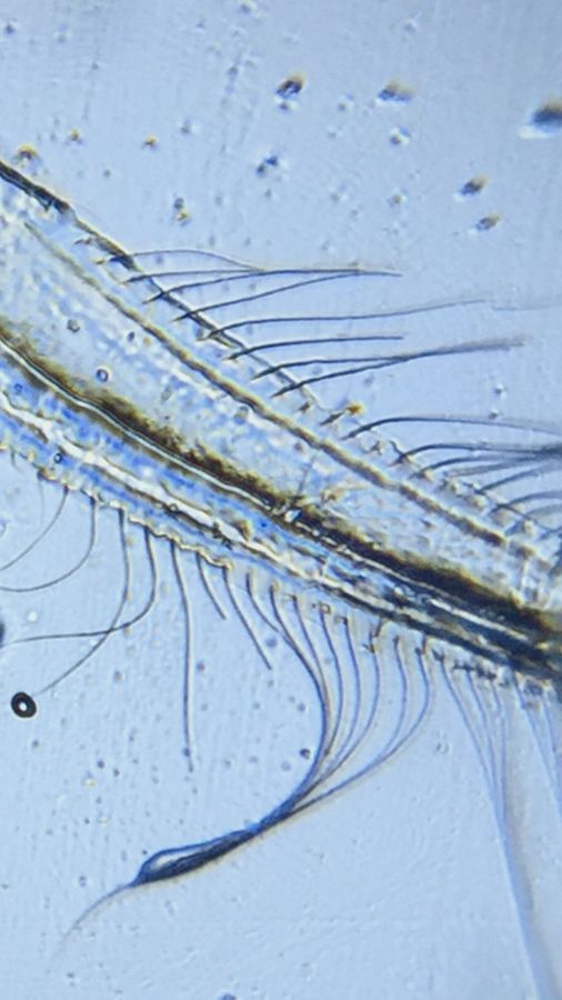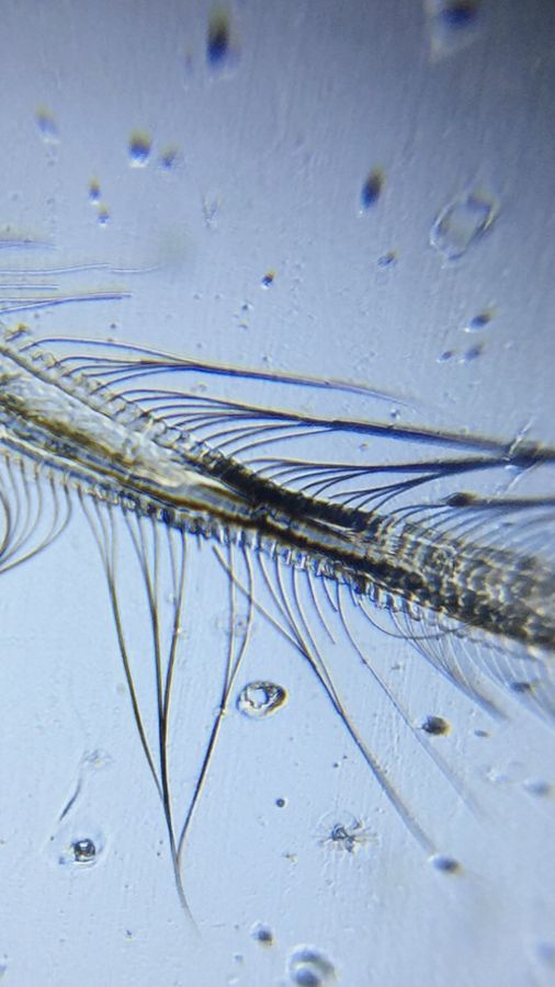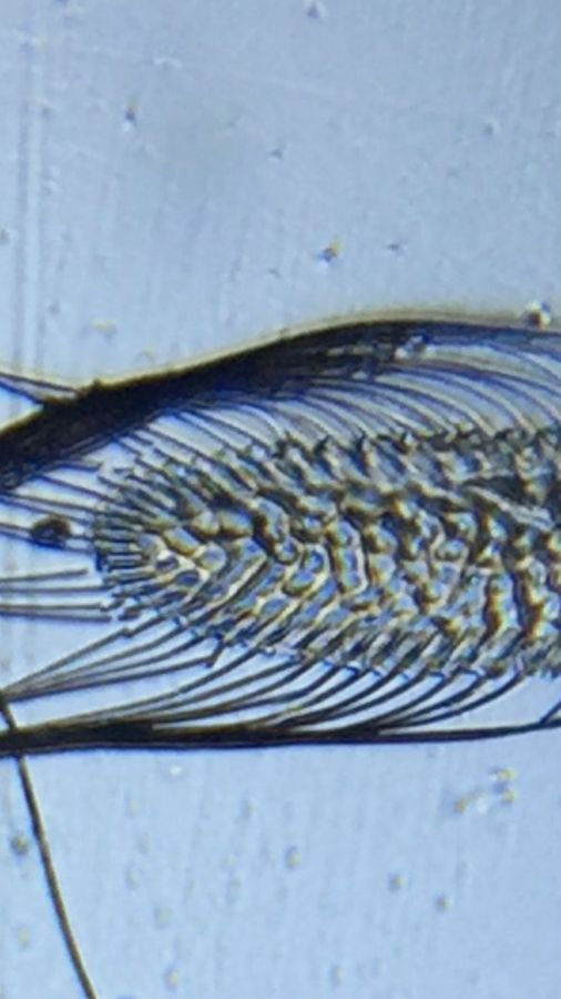 What’s interesting about thrips wings is that they are feather-like, having fringes of cilia running along each wing’s margin. In fact, the name of their order “Thysanoptera” was derived from the Greek words thysanos , “tassel or fringe”, and pteron , “wing”, for their fringed wings that look unlike any other insect wings, and are thus worthy of observation. Using my foldscope, I was able to examine each wing more closely.