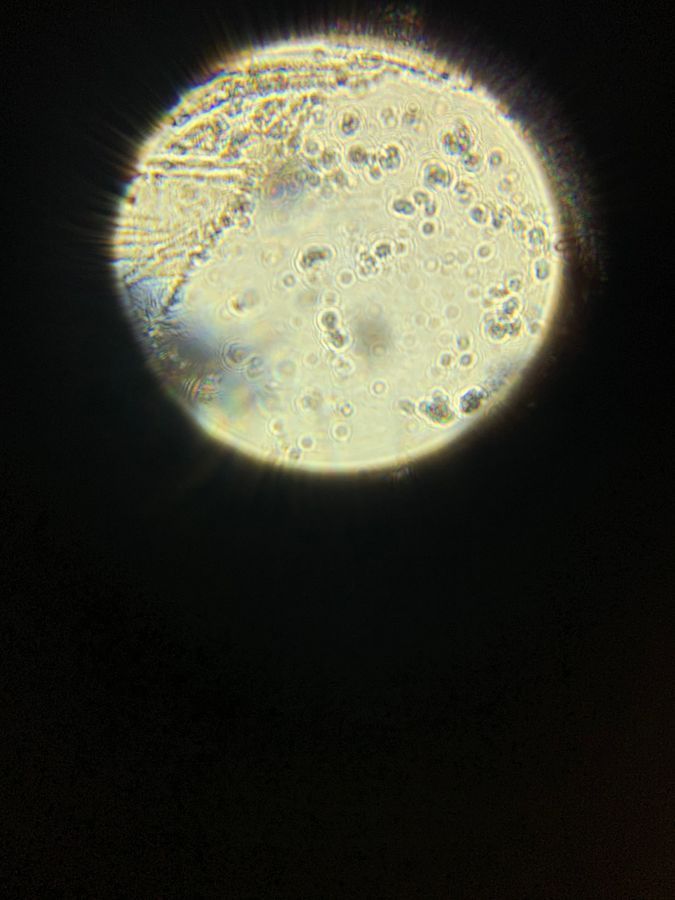 This image is a snapshot of a wet sample from a pond. The sample is translucent and slightly green, but mainly clear. The sample was obtained on April 8th, 2019 at 4:50 pm from a Turtle Pond via falcon tube insertion. The organism shown is most likely of the prokaryotic domain as no visible nuclei are present in the organisms.