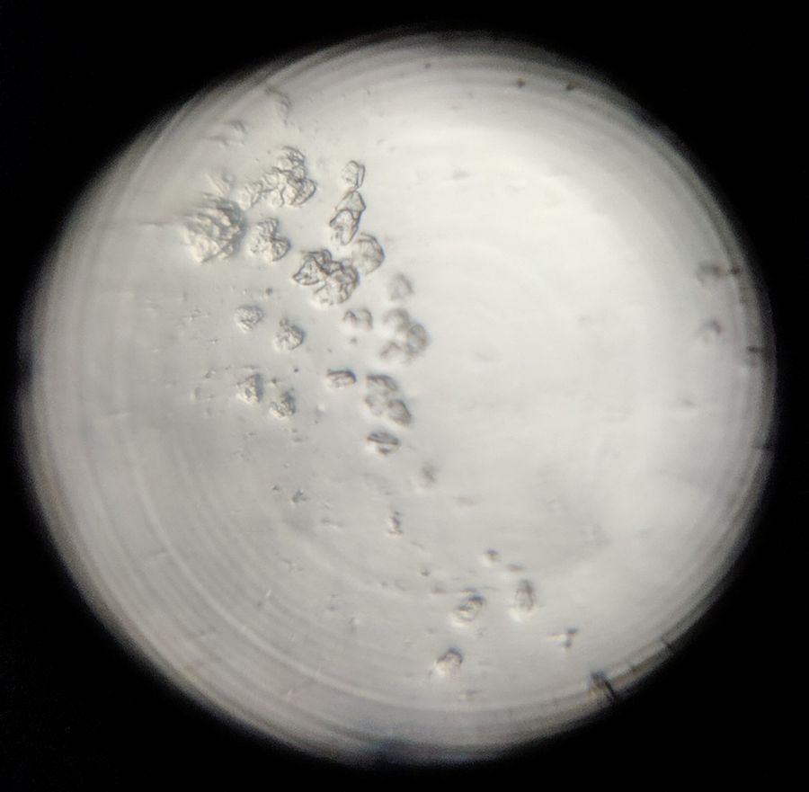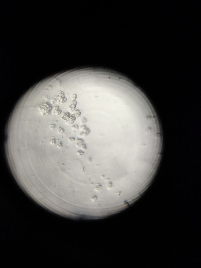 Pictured here is a cluster of cheek cells in a saliva sample. There may be some bacteria in the upper-left corner of the field of view, too.