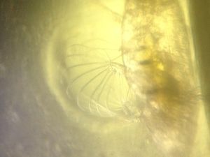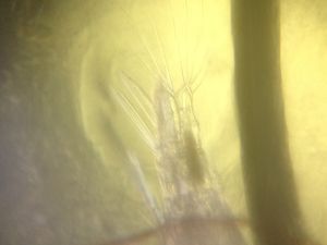 Even more interesting to me, though, was the tiny larva I found swimming in the water when I poured it into my plastic containers. About the same size as a copepod, it swam more smoothly through the floating bits, in a fluid line rather than a series of jerks. At first, I thought I’d caught another planarian, also a common resident of my water samples, but it turned out to be something new.