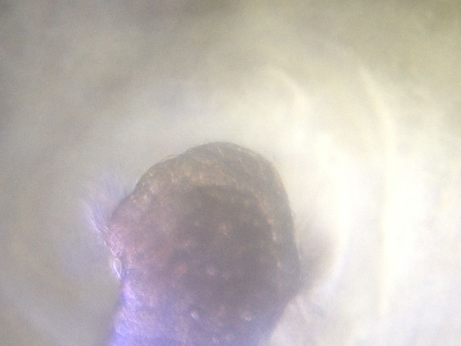 It’s a trocophore larva, one of the many interesting and strange phases of life that creatures like worms and molluscs go through. I have not a clue what kind of animal this one will become (if it grows to adulthood), but I am incredibly excited to have seen it in this state. A good view of its bands of cilia is visible in all the shots of it, on top and on the bottom of the larva. They work in tandem like the rotors of a helicopter, the front seeming to drive its motion while the back stabilize and direct it. Since it decided to stay still for a while, I took the opportunity to take a high magnification shot of it.