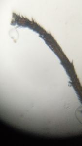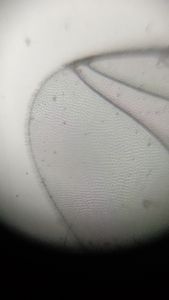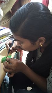 இப்படி முதின்ஸ் பதிவு செய்து கொண்டிருக்கும் போது பச்சை வண்ணத்தில் மின்னுகிற நிறத்தில் ஒரு ஈ செம்பருத்திச் செடியில் மயங்கிய நிலையில் அமர்ந்திருந்தது. அதனை கையில் பிடித்துகொண்டு வந்துவிட்டாள். அதன் இறகையும், அதன் கால்களையும் மடிப்பு நுண்ணோக்கியில் பதிவு செய்தாள்.