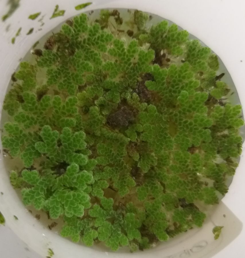 Anabaena Azollae is a small filamentous phototrophic cyanobacteria generally seen as a multicellular organism with two distinct, interdependent cell types. The first is a small, circular, photoautotrophic “vegetative” cell that performs oxygenic photosynthesis and is typically blue green in color. The second is a heterocyst; a larger, paler, more homogenous cell produced by Anabaena to fix atmospheric nitrogen. A. Azollae, although it can exist on it’s own, is usually found within ovoid cavities inside the leaves of the water fern Azolla. Azolla (also known as mosquito fern, duckweed fern, or fairy moss) is a genus of common waterfern whose small leaves accumulate on the surface of bodies of water creating mats.