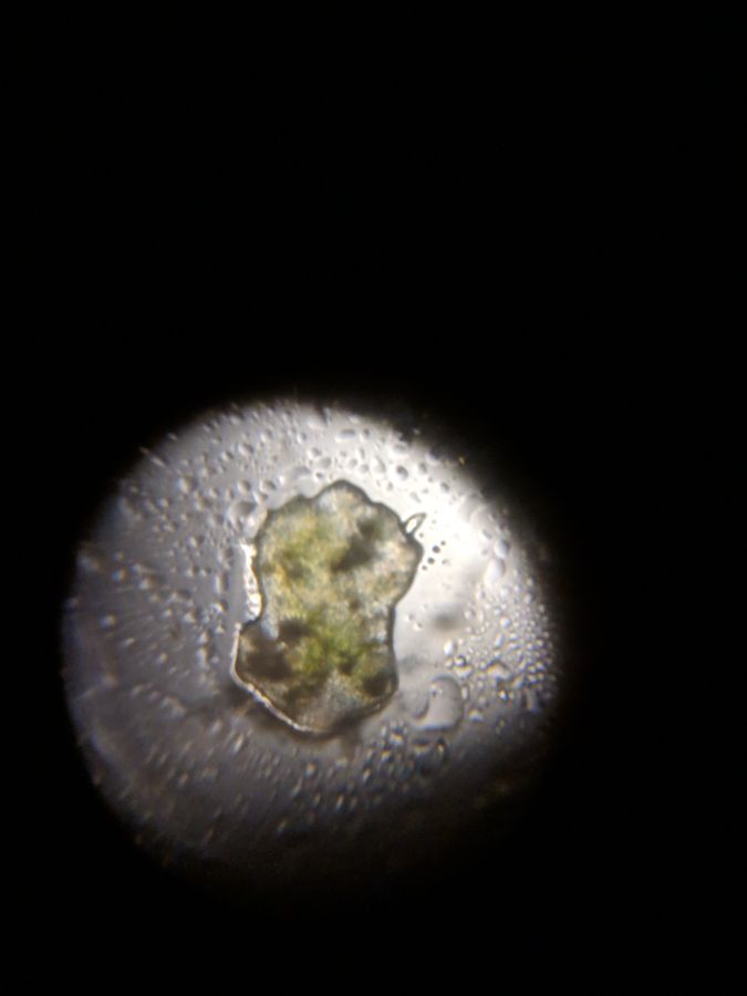 This is an magnified image of a green organism. It was next to a large piece of algae, so it might be algae. The sample was acquired last Wednesday, from Baxter Pond. It was obtained by the recitation section TAs, who took some water from the pond. From the Foldscope website, they have 140x magnification. This organism was large enough to appear on the slide as a dark speck, about half a millimeter long.