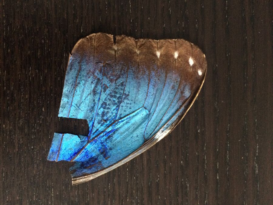 Here’s the wing that the slide was made from. There is a butterfly sanctuary in town and upon request it’s possible to get samples of butterflies that have died. You can see in the image the small section of the wing that was cut to make the slide; a glass slide and coverslip were used.