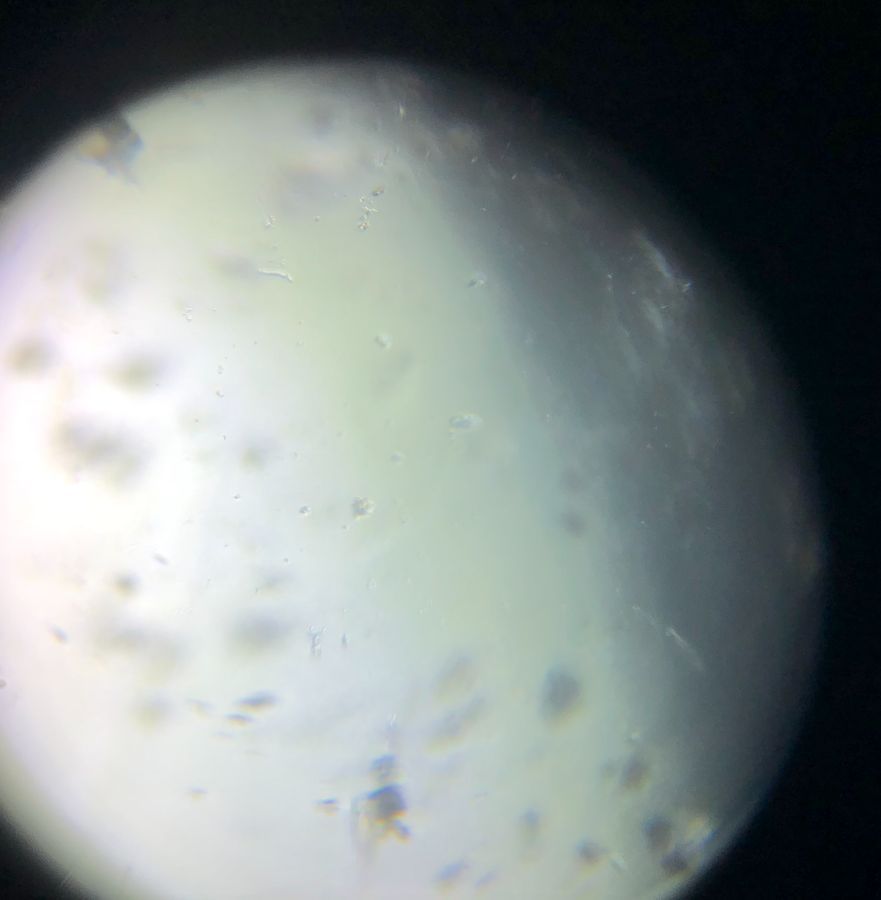In this photo can be seen algae from the turtle pond at the California Institute of Technology. The specimen was taken in the late afternoon using a cup and was used to demonstrate the creation of a “wet sample”. In the image, a small specimen of algae can be seen at the bottom of the lens. Although the image is slightly blurred the cells of the algae can be faintly seen. Algae are part of the domain Eukarya because of its multicellular makeup with distinct nuclei.