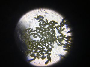 Here is 3 pictures taken of pollen in my foldscope with different amounts of light from underneath. The sample was obtained from the Throop Memorial Garden at Caltech at 3:30 pm on 5/3/19. I obtained the sample by plucking out the stamen and shaking the anther above the slide vigorously to get pollen onto it.