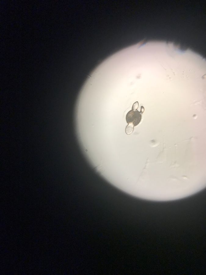 Pollen from pelargonium domesticum flowers. These flowers were found near the Athenaeum. The extraction was made at 7:30 PM on May 7th, 2019. The sample was obtained by shaking pollen off the anther of the flower and into a small container. Attached is a photo taken using a foldscope, and a picture of the flowers where the pollen was sourced.
