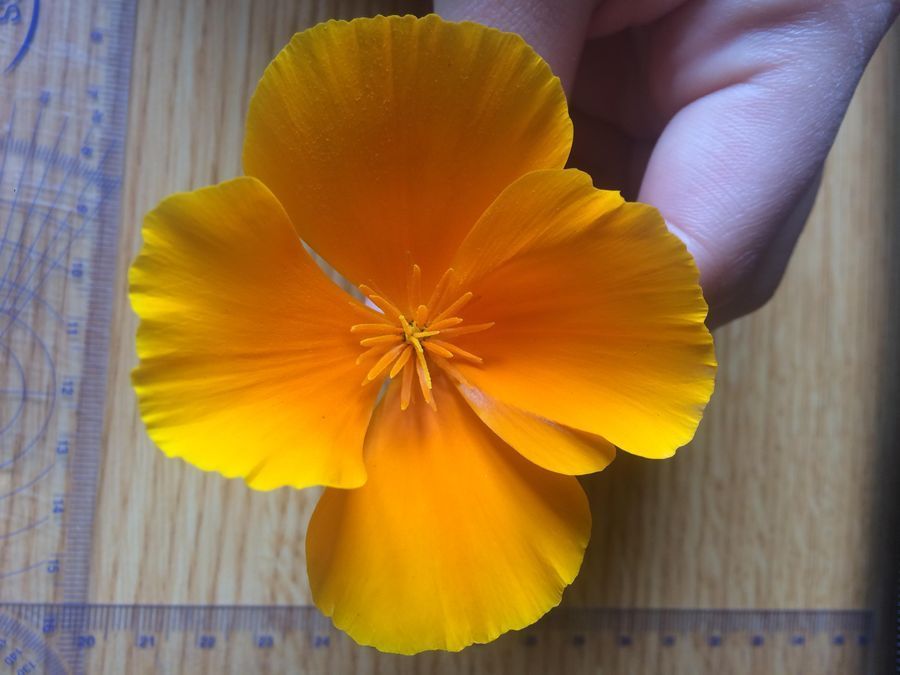 Image of Eschscholzia californica, also known as California poppy or golden poppy. Pollen can be seen in the center of the flower near the stamen and on the petals. (Note: ruler scale is in centimeters) This sample was acquired in the California Institute of Technology (CALTECH) Campus in Pasadena, California. The sample was located in the garden area near the east entrance of Lloyd House at the north side of the east end of the Olive Walk. The sample was obtained at 12:33 pm (PDT) on Thursday, May 9, 2019. In order to collect the sample, I cut the stem of one of the flowers to detach the flower from its roots. I then opened the petals of the flower to expose the stamen, which are the pollen producing parts of the plant, and then carefully shook the flower’s center over a clean microscope slide. This simple shaking movement caused most of the pollen to drop onto the slide. I then placed a cover slip over the part of the microscope slide that had the pollen and secured the slip with a small piece of tape. In the Foldscope image, I used a direct light source from a desk lamp to illuminate my sample. In the image, we can see numerous pollen grains of a greenish-yellow color that have slightly thick cell walls. These pollen grains are involved in producing the male gametes of the flower. After further research on the flower that the pollen was obtained from, I discovered that this particular flower is from the family Papveracea and is the species Eschscholzia californica, which is also known as the California poppy or golden poppy. It is also the state flower of California. #caltechbi1