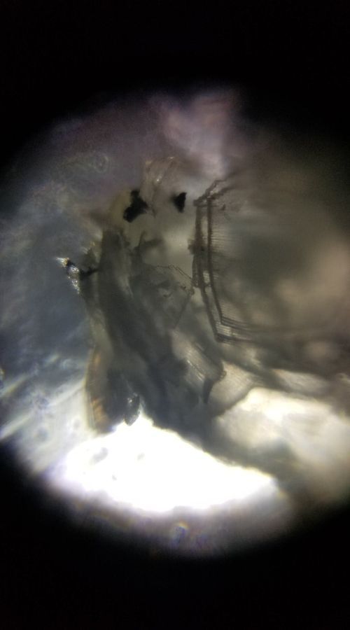 In the spirit of reproducibility, our group decided to get data from the local supermarket. For this post we will focus on the anchovies we obtained. The anchovies are the dehydrated ones found in packets, and they are usually added as flavoring to soups and other dishes. The first sample of the anchovy we examined using the foldscope was a cross section of the eye that contains the crystalline lens and aqueous humor. Here we observe the loss of structure of the sample, especially of the lens which can be seen as the dark spots near the top of the image, and the anchovy appears to have become discolored due to the dehydration and preservation process.
