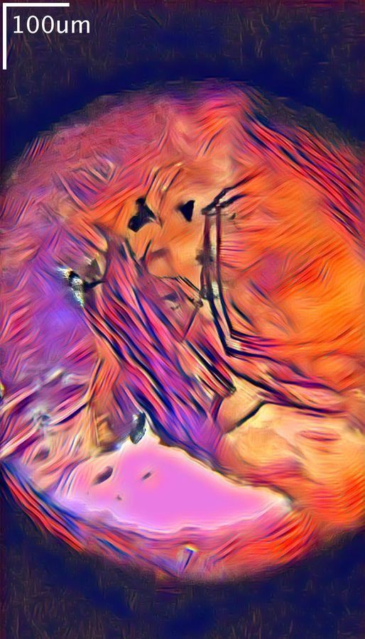 The inclusion of surrounding anchovy tissue in the sample makes it difficult to determine exactly which part of the eye is being shown, but the lens and aqueous humor are visible. The images were then post processed by adding a scale bar (100 um). This was done by imaging 1mm length lines using the foldscope and calibrating the images we took of the samples to the images with the 1mm lines. We then added the scale bars to the corner of the foldscope image using a matlab script. Contrast was additionally enhanced through post processing using a neural network. This was done to evaluate what we believe to be a bad example of post processing. As can be seen in the second contrast enhanced image, the style transfer based post processing may suffice as an art piece, but it does not add any meaningful improvements to the image. Below is the contrast enhanced image for the fish eye sample: