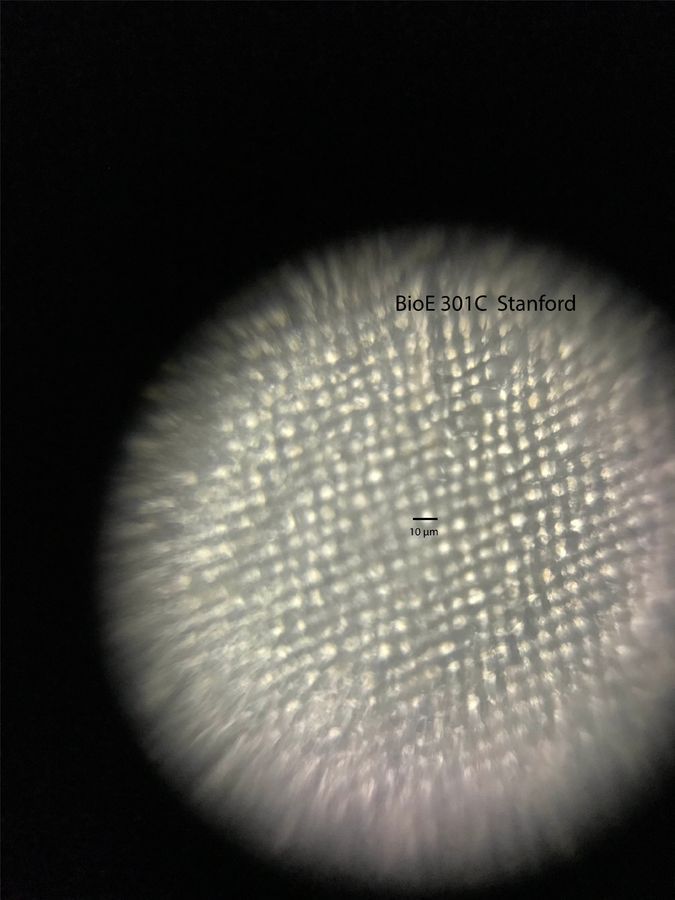 The mysterious creature captured under the foldscope. The image was take by an iPad. The scale bar was estimated via an image of the 5 μm nylon filter (in the foldscape toolkit) as shown below. I averaged over 10 holes to get the length.