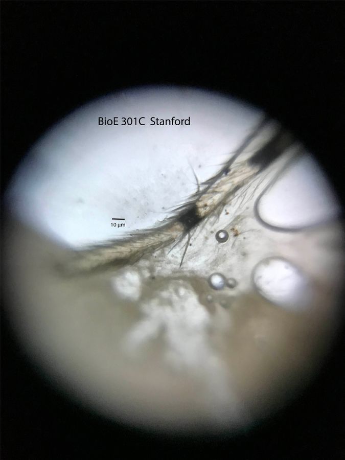 I enjoy the sunshine in California a lot, but I’m always bothered by the spiders here. Despite that the spiders are scary, they move fast and can even move on the ceiling upside-down. The mechanism that the spiders can move fast and also stable on the wall is interesting. So I captured one spider and imaged its leg under the foldscope. The scale bar was made by imaging a 5 μm nylon filter. There are many fibers on the spider leg, which may be useful to keep them on the wall. But it is still mysterious why they can move freely. The black node on the leg may be useful to stabilize the leg and protect it from breaking.