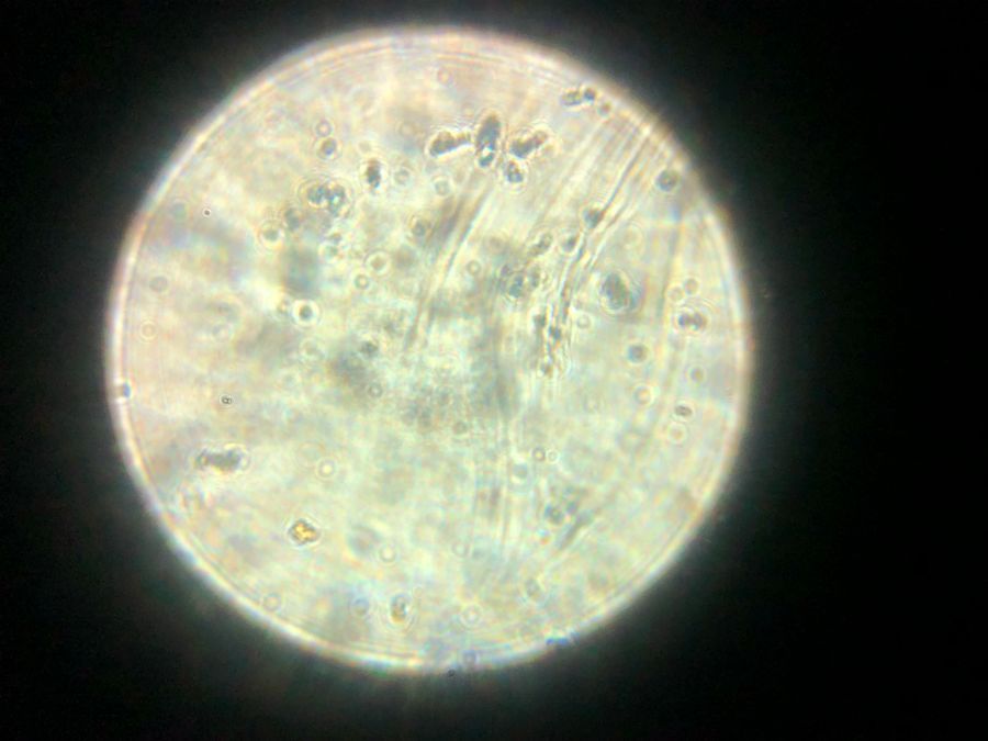 This image depicts a particularly tainted sample of pollen. The pollen cells are at the back and are the blurry, black, shadowed ovals and circular blob shapes. The other present entities are most likely dust or other particles. This sample was obtained at 2:05 pm on May 10th, 2019 outside of Beckman Institute. The sample was obtained from a small, white flower, shown in the image below. I broke the flower apart and rubbed the internals of the flower holding the pollen on their exteriors on the center of a glass slide. I then taped and sealed the swabbed pollen using a slide cover.