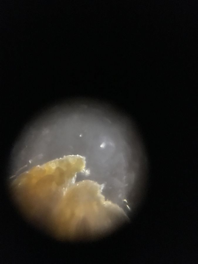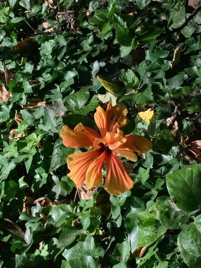 The image above depicts yellow hibiscus plant pollen obtained from a hibiscus flower outside of Page House, on Caltech’s campus (1200 E. California Blvd, Pasadena, CA). The sample was obtained at 11:00 pm PST on 05/10/2019, by picking a flower from the plant bushes on location. Several stamen were removed from the flower and rubbed with a cotton Q-tip; the resulting pollen sample was mounted onto a clean slide, taped down, and examined under the foldscope. a) The species of plant that the pollen originated from is Hibiscus Rosa-Sinensis Orange, from the kingdom Plantae. Physically, the flower has a reddish-orange appearance, with yellow oval-like pollen visible at its center. See secondary image below.