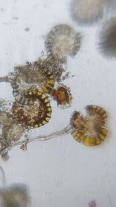 Spores coming out from the Sori Ferns are reproduced from spores that are gathered in clusters called sori, which are usually on the underside of the fronds. The spores can be yellow, green, brown, or black. The sori are sometimes covered with a membrane called an indusium, which will lift up when the spores are ripe.