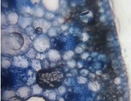 T.S of petiole stained with tryphan blue shows the single layered parenchymatous epidermis. Air spaces are more prominent. Scattered vascular bundles are present. Each bundle has sclerenchymatous bundle cap and shows xylem and phloem.