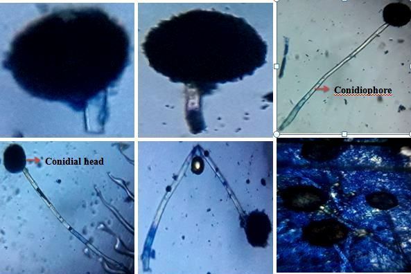 Microscopic structure of A. niger stained with tryphan blue, which shows the matured spores. The fungi were isolated from polluted lake water.