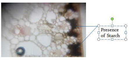 L.S of petiole treated with iodine solution shows the dark brown coloured cells in the cortical region, which indicates the presence of starch.