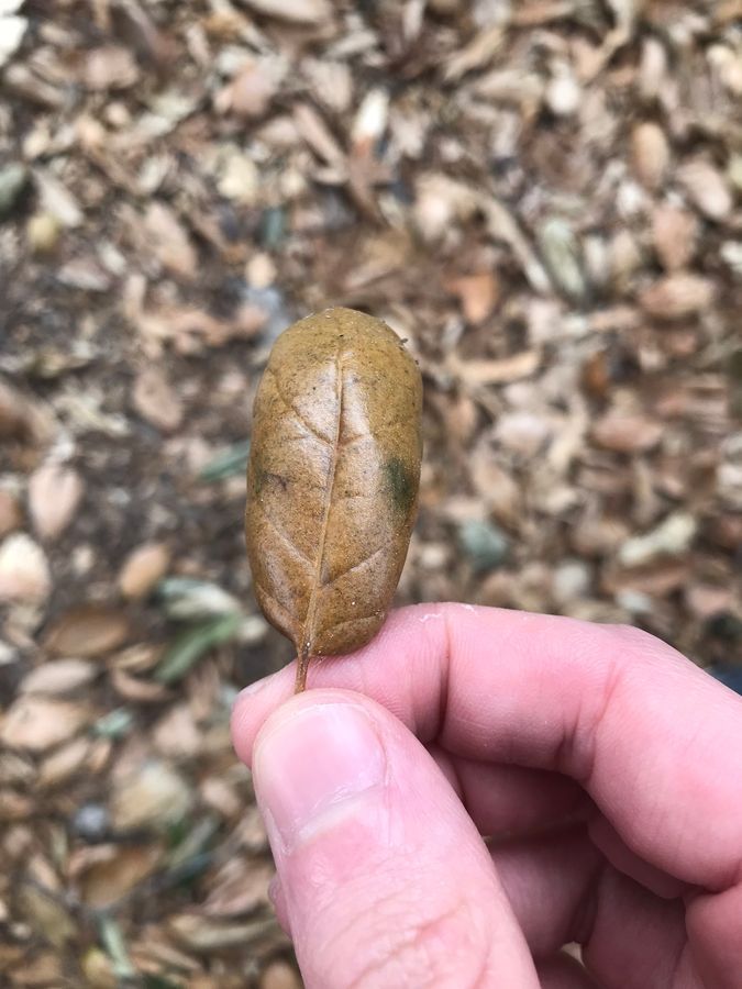 The sample (left image below) was collected at 2:01 pm on 5/27/2019 at the California Institute of Technology, outside of Ruddock House (1320 San Pasqual St, Pasadena, CA 91106). It was taken from a pile of dead leaves (right image below). It was not attached to anything, so I was able to simply lift it from the pile.