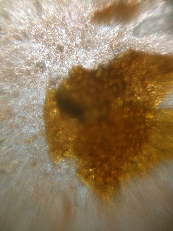 This image shows a sriracha droplet under a foldscope. One can see lots of small orange particulates everywhere in the image and that there is lots of gaps for light to come through. A large orange mass is also present. The mass has many dark lines on it that separate the mass into small sections that look similar to cells. This sample was taken at 2:24 pm on 5/28/19 from the Page house dining hall at the California Institute of Technology. The sample was prepared by squeezing a small drop of Sriracha from the Sriracha bottle. #caltechbi1