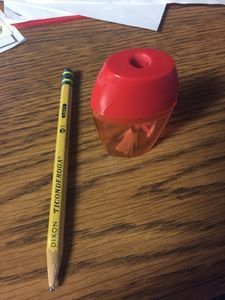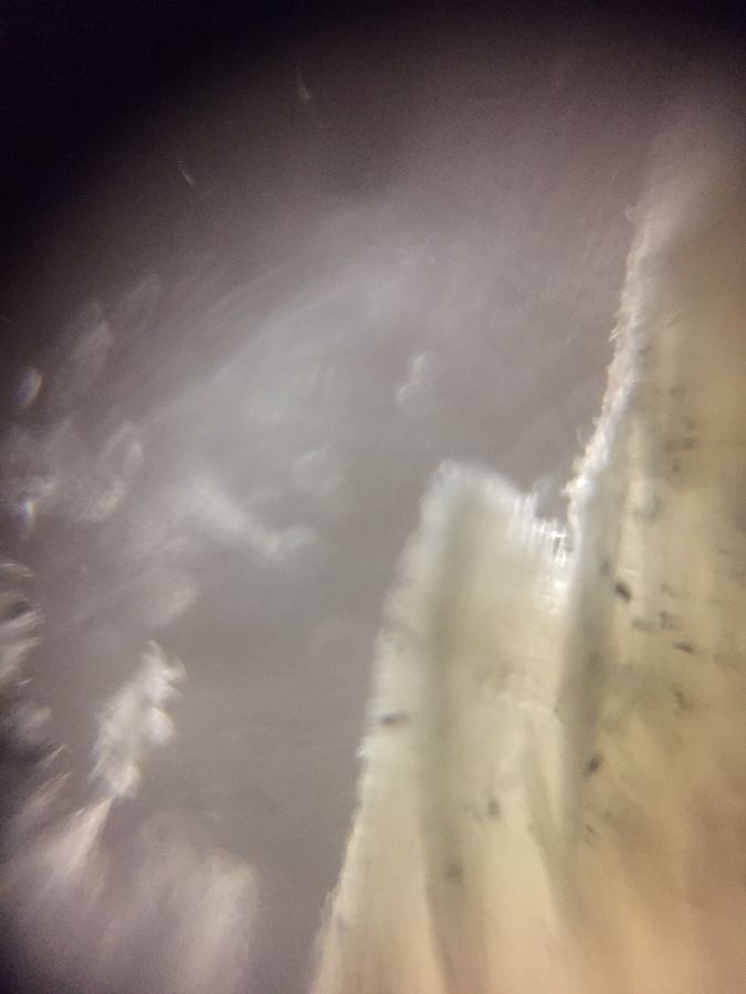 This image shows a pale mass with a few dark spots on it. On the perimeter, the object is jagged. There are also vertical lines on the object, which are especially visible on the left side of the object. The sample was taken from Page house room 143 in the California Institute of Technology from a white towel at 1:34 pm on 5/28/19. The sample was obtained by using a pencil sharpener on a Ticonderoga HB2 soft pencil to collect the shaving, and the shaving was then placed on a slide. #caltechbi1