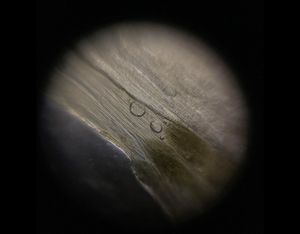 Above is an image of a yellow dandelion in Avery Courtyard in Caltech in California. This foldscope image depicts the pollen obtained from the yellow dandelion at 2pm on Tuesday, May 28. The pollen was obtained by removing stamen from the flower with tweezers and placing a small portion of the stamen onto a foldscope slide. In the actual foldscope image, three oblong grains of pollen are visible in the bottom right hand portion of the image. The clear filament surrounding the pollen is the remnant tissue from the flower’s stamen. #caltechbi1