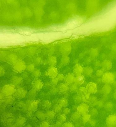 A leaf from the plant as viewed underneath the Foldscope with what appear to be stomata visible.