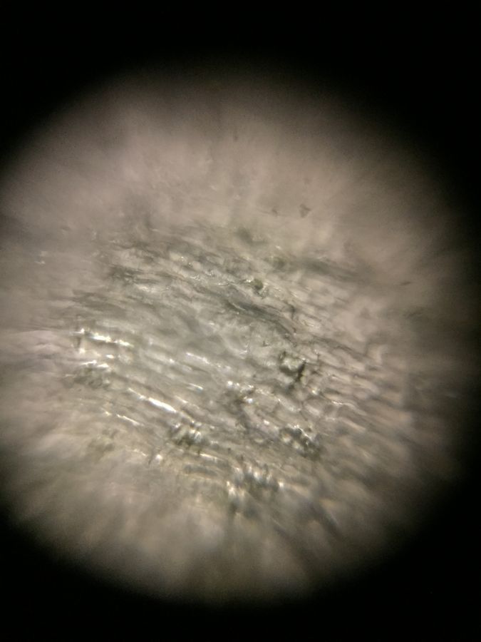 This is an image of the cellular structure of celery (apium graveolens) where we can see the individual cells divided by cell walls (the darker lines). The cells seem to be in standardized rows, with similar height, although the columns are offset. Looking closely, water is seen in the cells, and the water pressure provides stiffness in the stalk. The sample was obtained from the north house open kitchen salad bar, a little after 2:10pm on 5/30. An extremely thin slice of celery was taken, so that the slice was translucent, and sample made. You may notice that a few of my posts are common vegetables. I wanted to compare the structures of vegetables and see any identifiable differences.