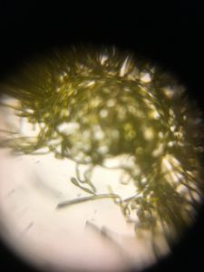 Irene Chang, Sec 7 Extra Credit Submission 2 Sample Name: African Iris White flower Date/Time: 5/30 at 5:37 pm near Millikan pond Sample was obtained by using tweezers to remove the yellow fuzz from the petals. They were then placed on the glass slide. After putting on a cover slide, the photo below was obtained. We can see in the image the curly strands and fibers that make up the fuzzy lining. #caltechbi1