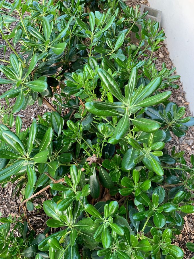 Schefflera Aboricola plant before being sampled from. Sample (whole leaf) was obtained outside Ricketts Hovse at Caltech (1200 E. California Blvd, Pasadena, CA) at 7:45pm PST. The leaf was plucked from its stem and was analyzed.