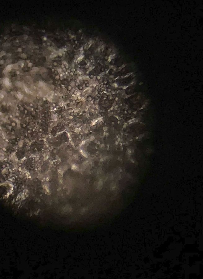 This photo is of a sheet of seaweed. You can see a pebble like cellular pattern throughout the seaweed. This specimen was obtained by unraveling the seaweed from an ahi tuna wrap from the Caltech Dining Hall, better known as Chandler. It was obtained around noontime on May 31st.