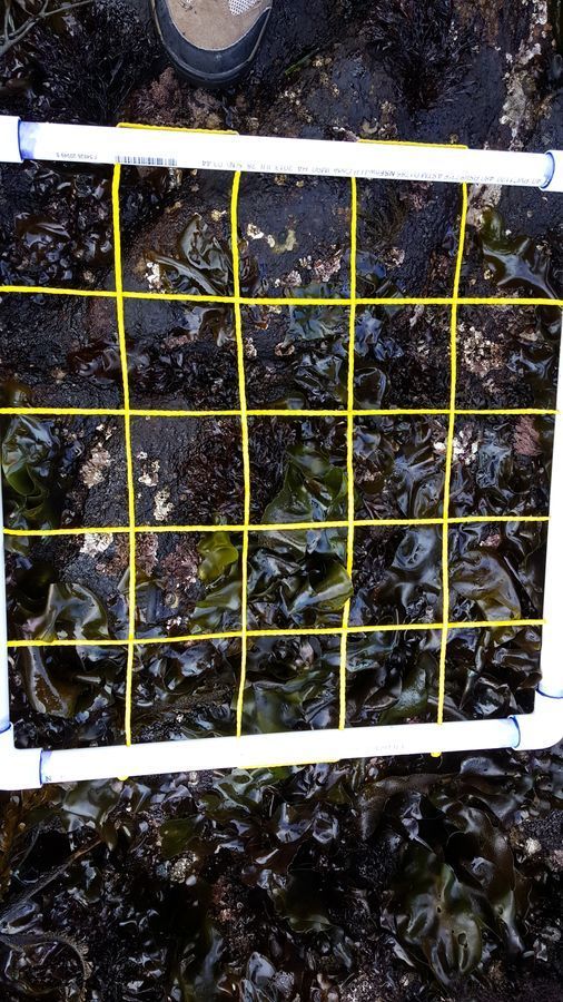 A day in the intertidal zone at Carmel Point, California. Hello fellow scientists! My name is Larissa Lemon. I am a graduate student in the Applied Marine and Watershed Science Program at California State University Monterey Bay. Every person in our Marine Ecosystems class was given a Foldscope to use throughout the semester. We recently took a trip to the rocky intertidal at Carmel Point, California. This was a fantastic opportunity for me to use my Foldscope in the field! I looked at pieces of iridescent algae ( Mazaella sp.) that I found floating in one of the tide pools. These algae have a range of colors from dark purple to greens and even black, but underwater they shimmer with an iridescence. It was quite common in the low intertidal, as seen in my quadrat photo below. Along with some fellow students, I decided to bring some floating algae and sea water back to the classroom for an extended exploration of organisms with my foldscope.