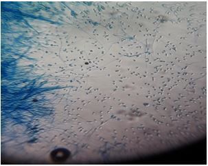 Fungal spores stained with Lacto phenol cotton blue The fungi were isolated from Eichhornia crassipes . And the spores were stained using Lacto phenol cotton blue and captured using foldscope. The pictures shows the hyphae and spores.