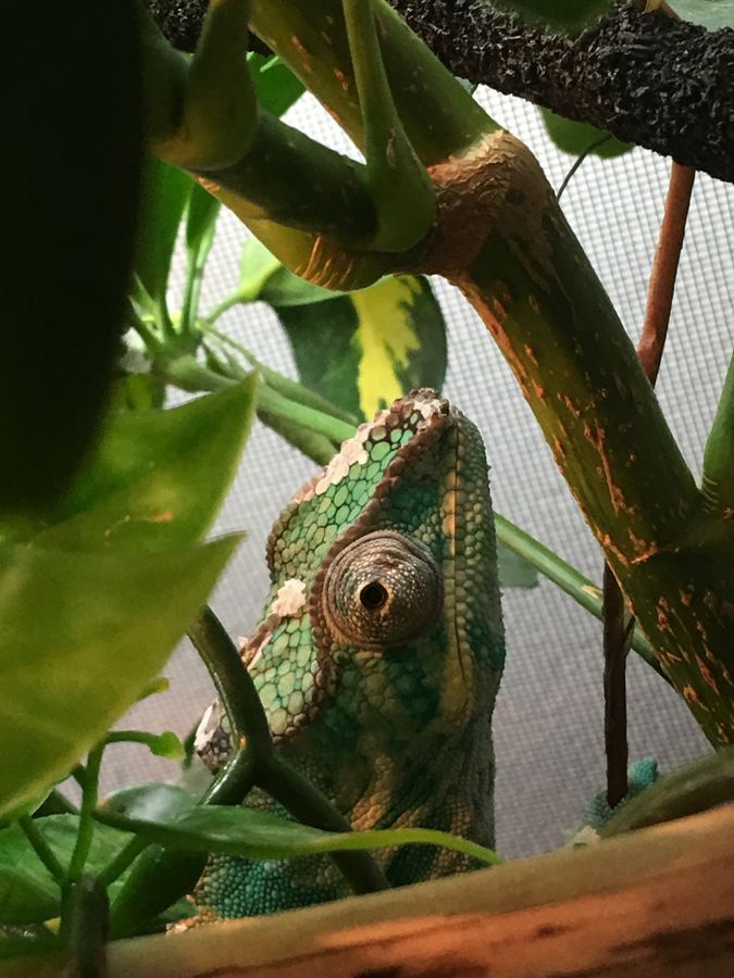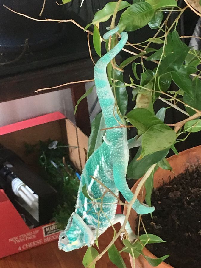 In past housing situations I’ve been lucky to enjoy play-only relationships with dogs whose physical and health needs were otherwise met by their responsibility-laden owners. Having recently moved into a new shared rental, I’m experiencing a unique treat in that one of my housemates is a true-story Chameleon owner. Pancake is a stunning-in-teal Panther Chameleon, species Furcifer pardalis . This species originates in northern Madagascar and is prized by exotic pet owners for its bright display of color-changing skin.