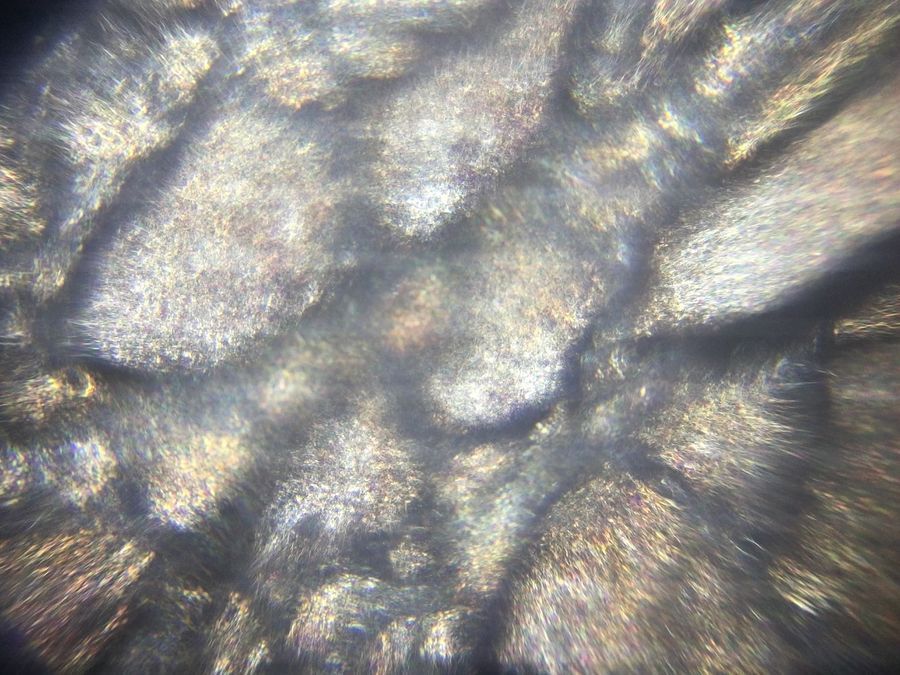 I found that by keeping the sample still and rotating the flashlight so that the direction and distance of the light source shifted, the skin would refract a beautiful kaleidoscope of colors! Right away I could tell I was onto something with my color-changing question. If pigment-based chromatophores were causing the color change, why would the skin left behind be so dang colorful? There had to be more to it…